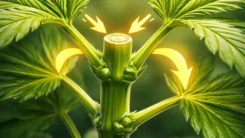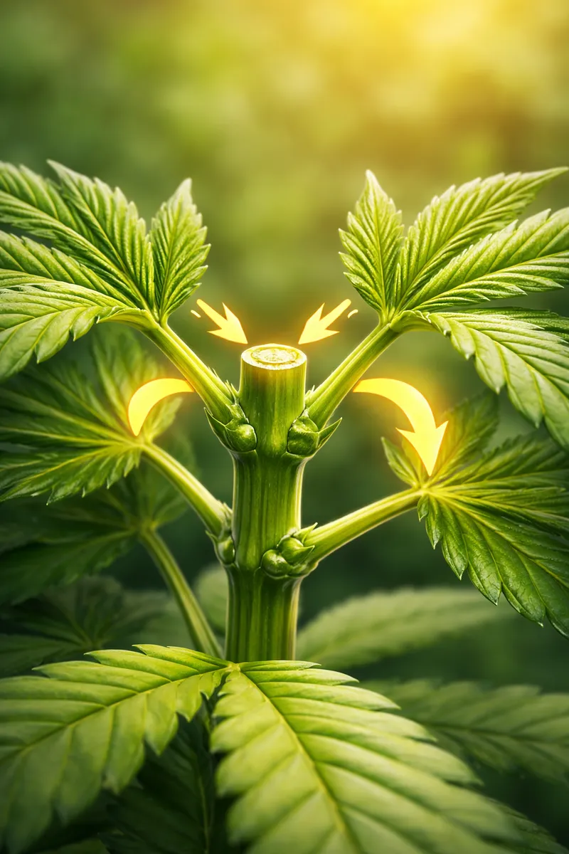 Wenn Grower über die Internodie sprechen, meinen sie den Abschnitt zwischen zwei Knoten. Ein Knoten ist die Stelle am Stamm, an der ein Blattpaar sitzt und gleichzeitig kleine Seitentriebe entstehen. Diese Knoten sind deine Orientierungspunkte. Beim Topping schneidest du nicht nach Gefühl, sondern bewusst an einer Stelle, an der die Pflanze darunter genug Kraft und genug Seitentriebe hat.